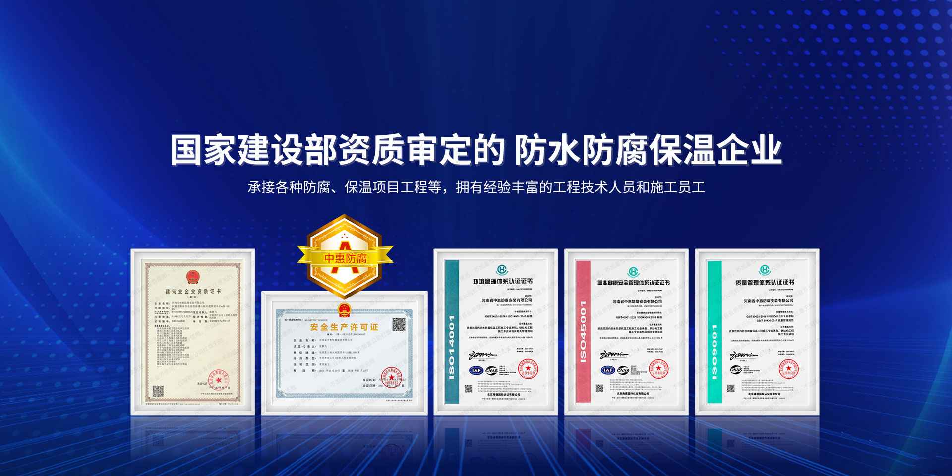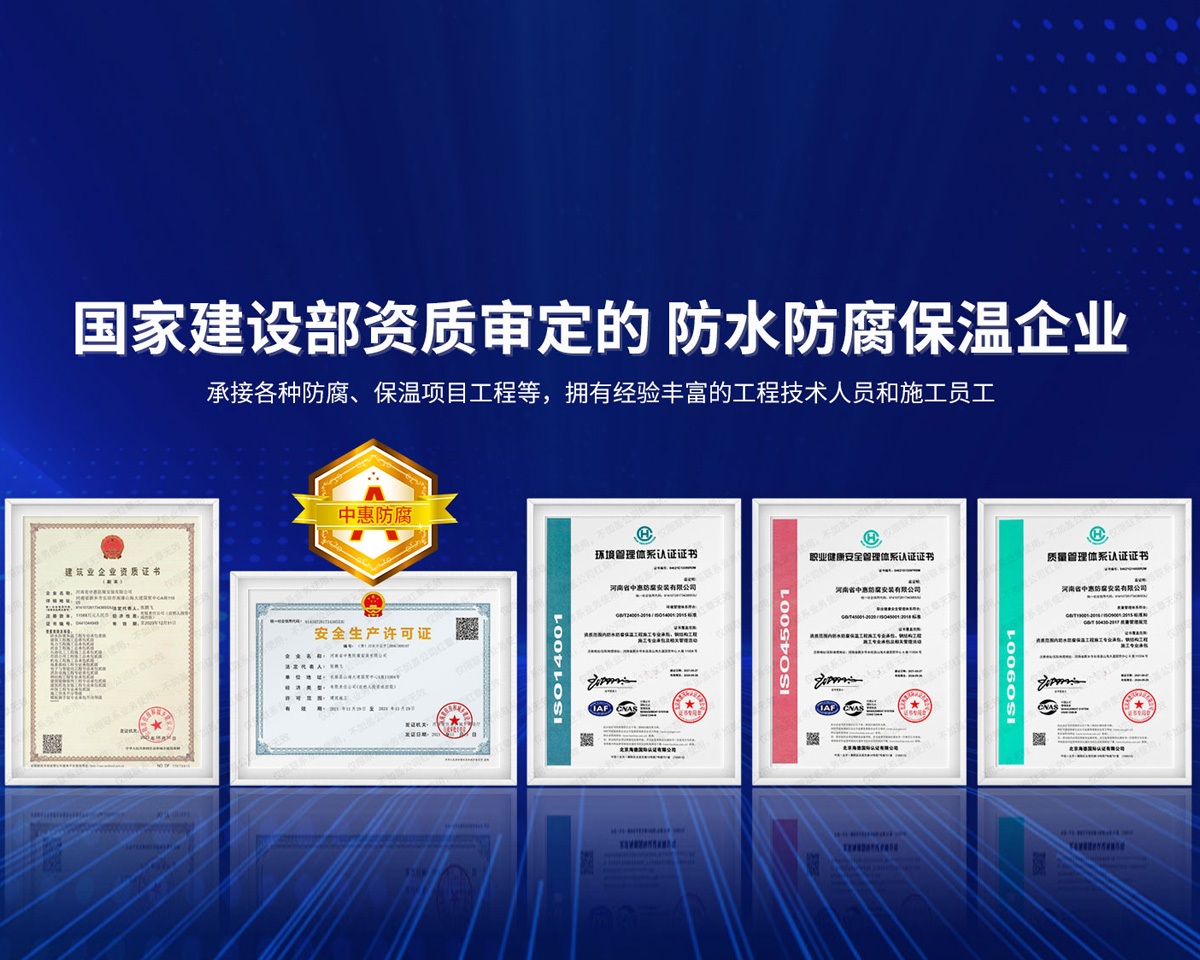 公司經營范圍:防水防腐保溫工程;消防設施工程;建筑裝修裝飾工程;建筑機電安裝工程;電力工程;建筑工程;石油化工工程;工業清洗工程;油罐清洗工程;鋼結構工程;環(huán)保工程;模板腳手架工程;電纜防火封堵、防污閃噴涂、外墻外保溫工程;各類施工勞務作業;設備維修、船舶鉚焊、涂裝;電力工程材料、建材、防水材料、防火材料、防腐保溫材料銷售,并相繼通過了GB/T19001-2008idtISO9001:2008GB/T50430-2007質量管理體系認證證書。GB/T24001-2004idtISO14001:2004環(huán)境管理體系認證證書。GB/T28001-2011idtOHSAS18001:2007職業健康安全管理體系認證證書。公司是中國防腐蝕于防護協會、中國施工企業管理協會、電力協會和中國鋼結構防水協會會員單位。 公司的經營業務涵蓋了石油、化工、電力、冶金、煤炭、船舶、國防、燃氣、水利、環(huán)保、交通運輸、航空及國防軍工和輕紡市政等行業的防腐保溫絕熱設備。鋼結構安裝、防火、防水、金屬噴鍍、聚脲噴繪、陰極保護、防滲透堵漏、玻璃鋼及各種磚版材料襯里、橡膠襯里、煙氣硫和耐酸溶劑腐蝕等工程施工。公司連續(xù)十年榮獲“省市先進施工企業”“安全生產先進單位”“重合同,守信用企業”和“AA***資質企業”的稱號。2000年被命名為市級文明單位,2002年被國家工商行政管理局命名為“重合同,守信用的企業”、被中國工業防腐蝕技術協會命名為“防腐蝕企業,能源節(jié)約及環(huán)境保護領域有豐富的經驗和***的業績。工程一次交驗合格率100%。其中攀枝花鋼鐵公司煉鐵廠四號高爐及熱風爐防腐工程、上海寶鋼公司煤氣柜防腐工程、撫順石油一廠裝置防腐項目、齊魯石化公司稀烴廠高塔防腐工程、吉林化學工業公司煉油廠油罐防腐工程、天津石化熱電廠六號爐頂棚聯絡管保溫工程、大慶油田(太倉)力神泵業工程、中國化學工程第十一建設工程、中原油田勘探局工程、中國石化銷售有限公司華北分部、魯皖輸油管道工程、貴州開磷息烽合成氨工程、陜西黃陵煤化工程、中國石油天然氣西部管道塔里木輸油工程、邯鋼集團邯寶鋼鐵公司煉鐵工程、德州供電工程、吉寶(南通)船廠工程,偃師華潤熱力工程、鄭州熱力總公司。 河南省中惠防腐安裝有限公司愿以豐富的施工經驗,***的技術,***的設備,***的管理,***的服務,竭誠為國內外廣大的用戶提供***滿意、******的工程作品。 我公司愿與國內外同仁一道,團結協作,共同推進防腐蝕行業發(fā)展! 公司地址:河南省長垣縣建設路北段360號 固定電話:0373-8866488 郵編:453400 網址:http://www_zhff_com_cn.hbgkdm.com